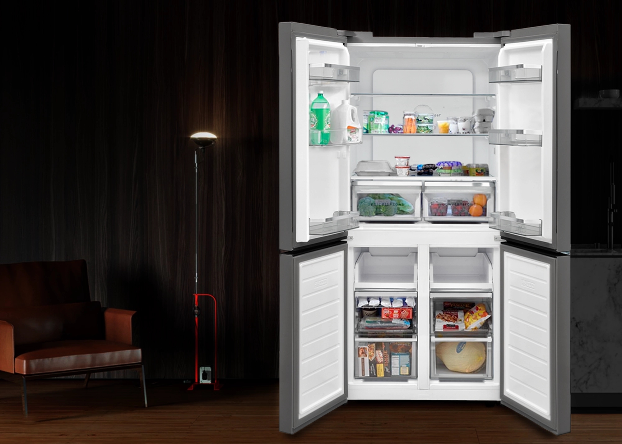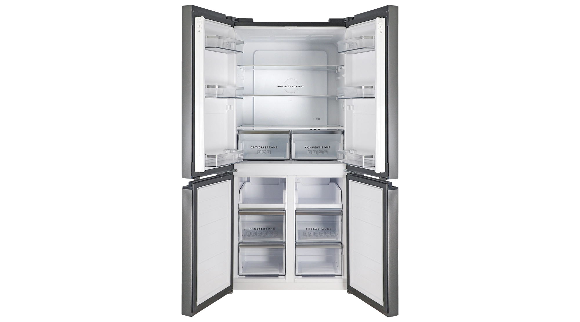 Це ідеальний варіант, якщо потрібна велика місткість. Холодильне відділення розташовується зверху з загальним об’ємом 319 л. Морозильна камера загальним об’ємом 140 л розташована знизу і поділена на 2 відділення. Зручність полягає в тому, що техніка виходить місткою, а для доступу до потрібного продукту достатньо відчинити одну дверцю. Однією з переваг холодильника French Door є можливість використовувати повну ширину холодильника для зберігання продуктів. Холодильники по типу Side-by-Side використовують лише 50% своєї ширини.