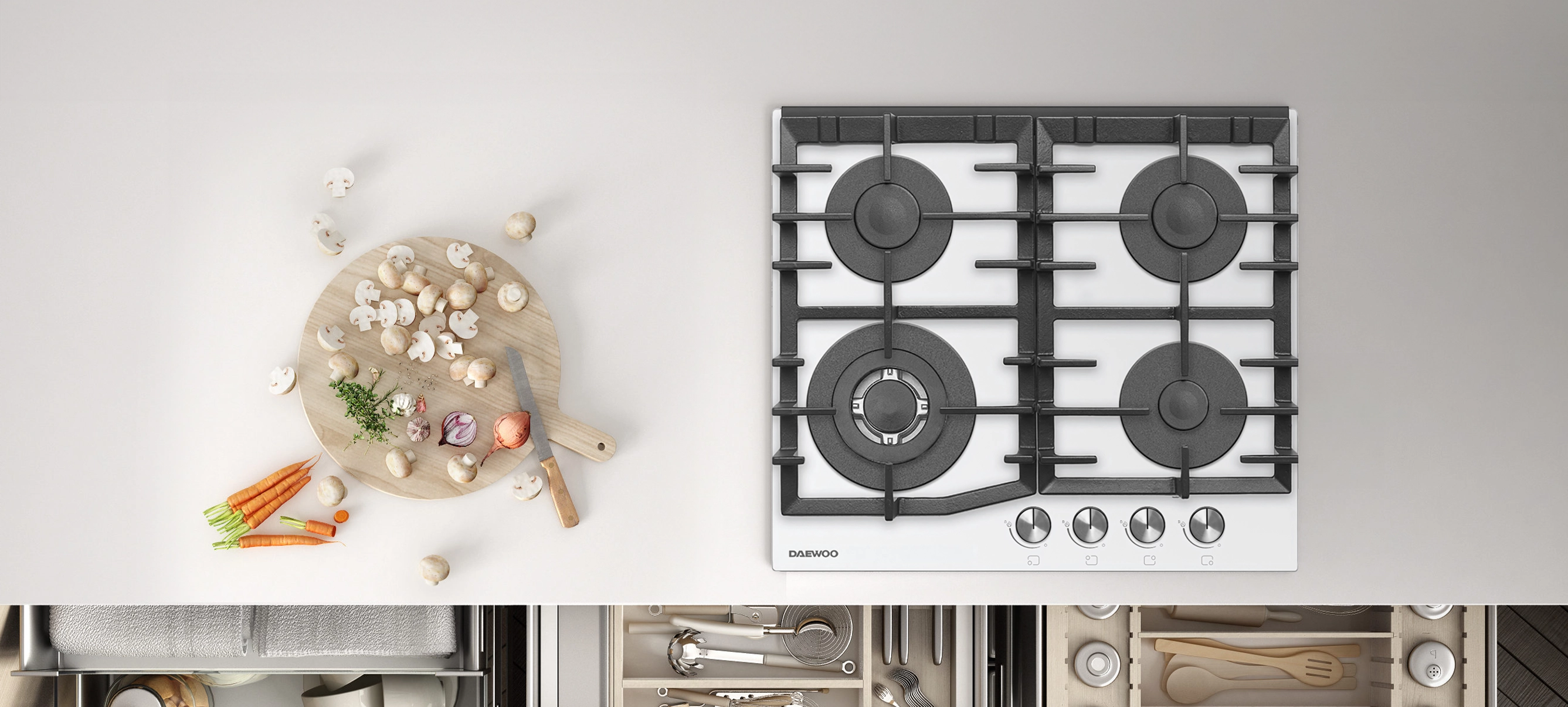 Варильні поверхні DAEWOO – це класичний вибір для сучасних кухонь, вони сподобаються шанувальникам лаконічного та функціонального дизайну. Техніку DAEWOO легко комбінувати зі штучними та натуральними оздоблювальними матеріалами, а також іншими кухонними приладами. З поверхнею можна створити композицію у темних насичених кольорах або вигідно підкреслити контраст, комбінуючи чорні варильні поверхні зі світлими елементами інтер'єру.